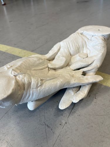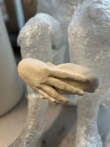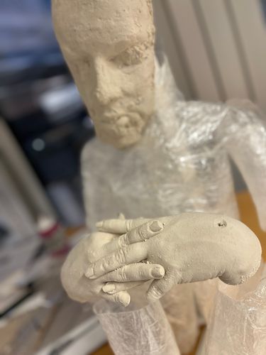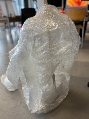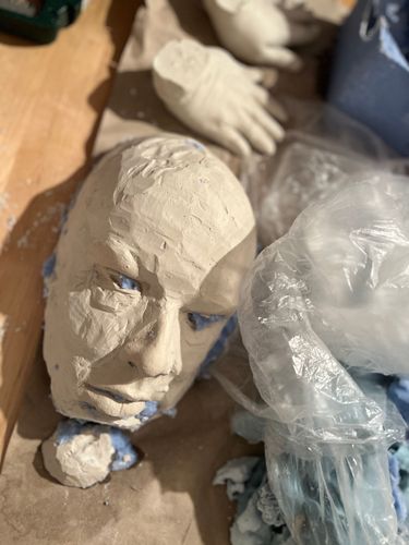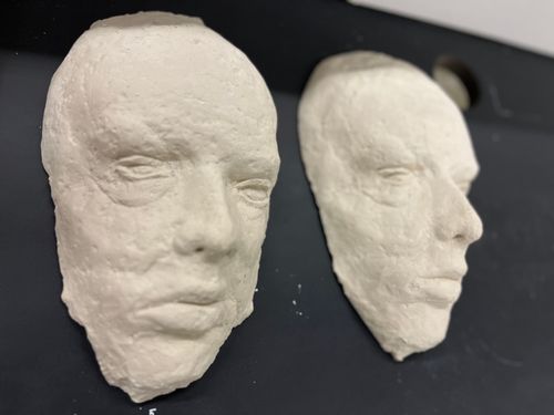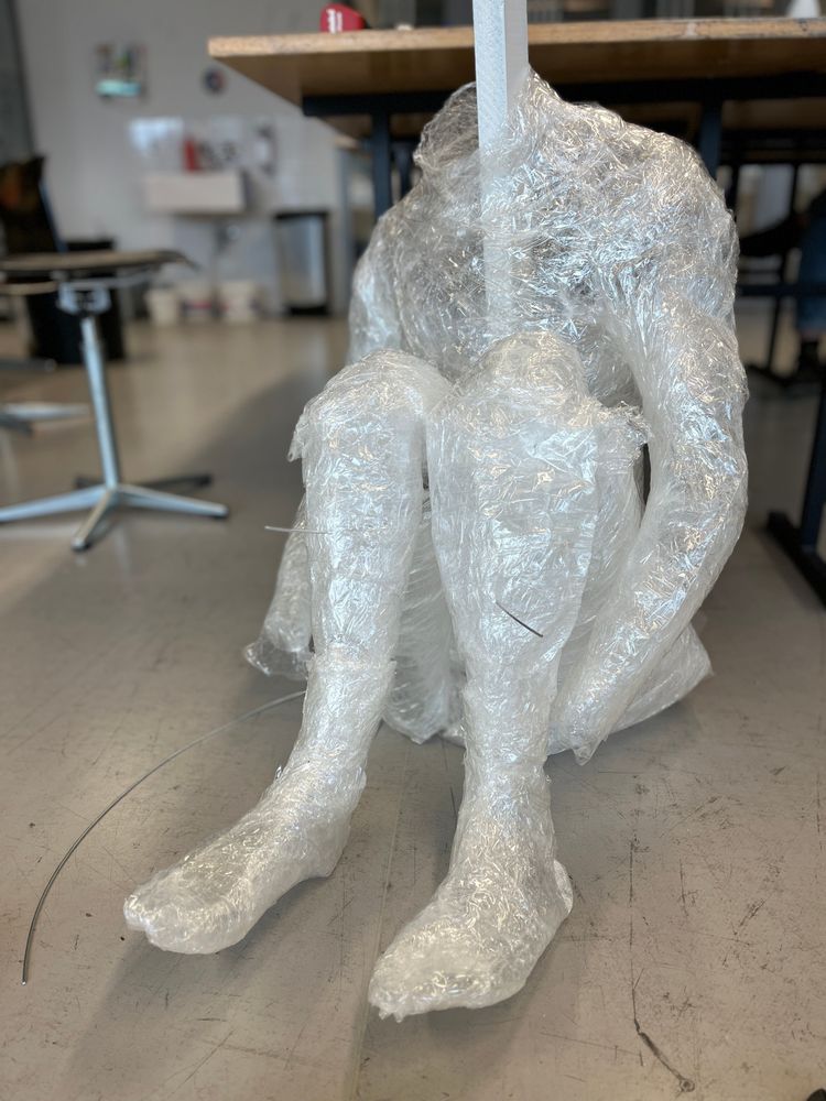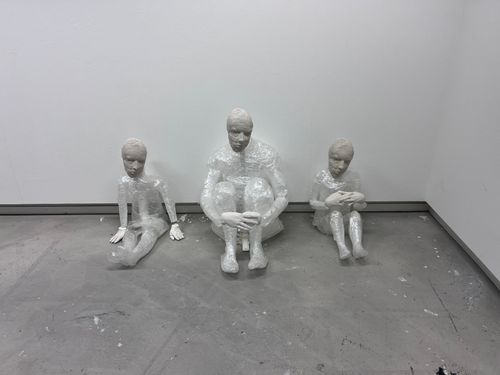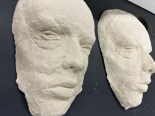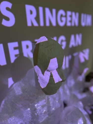Wichtig ist auch hier der Prozess der wechselseitigen und gegenseitigen Bedingung von Material und Inhalt, wobei auch die sich verändernde Konsistenz des Materials von Bedeutung ist, beziehungsweise war. Das Formen und Angleichen der Gesichter, im Prozess der Erarbeitung, ist zu Beginn einfacher handhabbar, der Gips ist noch nicht komplett ausgehärtet. Die Bearbeitung wird schnell schwieriger, bis das Material komplett ausgetrocknet und fast zu fragil ist, um noch etwas verändern zu können, oder nur mit grösster Vorsicht und der Gefahr, etwas irreparabel zu schädigen. Diese materiale Herausforderung erlaubt einen Bezug zu der mit ihr dargestellten Realität, die über die Zeit hinweg ebenfalls von Fragilität und der erschwerten Veränderung gekennzeichnet ist: Im ‘kindlichen’ Subjekt stellt sich die Frage nach der eigenen Identität, wenn Erinnerungen nicht Dokumentation von Erlebtem, sondern Programm des ‘erwachsenen’ Subjekts sind. Eine Bewertung der eigenen, als ‘Erinnerung’ dokumentierten Identitätsfragmente ist schwierig, und eine Korrektur einer Erinnerungsdoktrin ist, wie im Material der Arbeit, je länger, desto unsicherer. Metaphorisch und allegorisch bieten sich viele Begriffe an, die Inhalt, Material, Prozess und fertige Arbeit miteinander verbinden und auch hier treffen auf der Metaebene wieder das Konzept der ‘automatisierten Folie’ und der poetischen Funktion von Sprache mit der materialen Ausgestaltung der Subjekte aufeinander: sowohl in den transparenten Körpern (entstanden mit Folie beziehungsweise Klebeband), die die Habitualisierung beziehungsweise Konventionalisierung der Erinnerung zeigen, wie auch in der Kontrastierung mit den opaken, steinernen Gesichtern (Verfremdung), die, wie in der Erkennbarmachung von Sprache durch Poetizität, erkennbar werden durch sichtbares Einwirken einer der subjektiven Erinnerung fremden, externen Autorschaft.